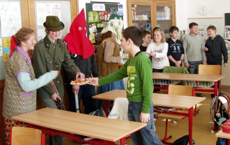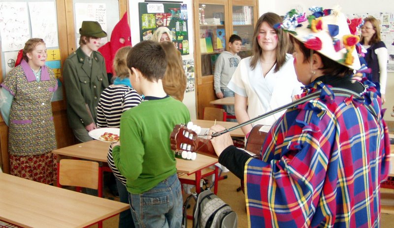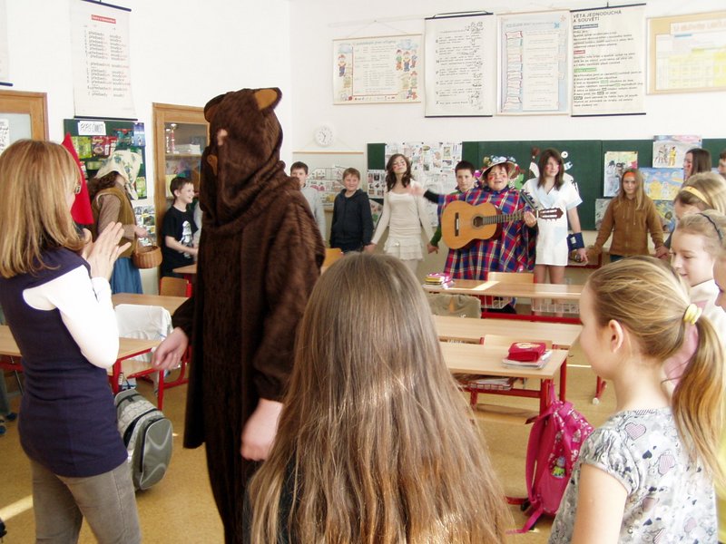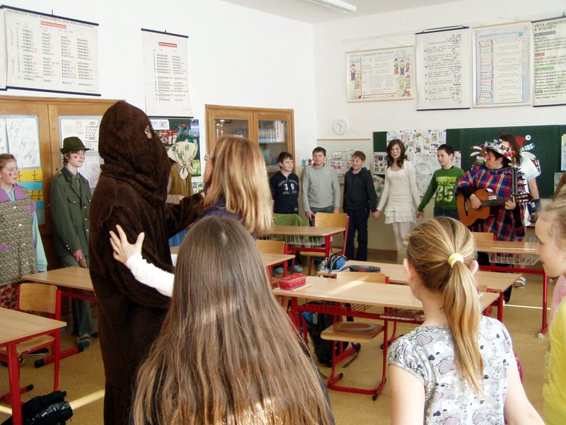 Masopust je v naší obci spojen s mnoha radovánkami. Šibřinky, vodění medvěda i pochovávání basy. Na tyto akce se vždycky těšíme. Tradice se u nás ctí. A aby se nevytratily, vymyslela naše paní ředitelka vodění medvěda školou. Osmáci se toho chopili a pro velký úspěch chodí za maškary, rýmují a předzpěvují za doprovodu kytary i ozembouchu už třetím rokem. Masky se představí a medvěd, zpovzdálí sledován medvědářem, vytáčí v kole jednu paní učitelku za druhou. Děti ve třídách se ochotně přidávají k této taškařici a odměňují milou návštěvu úsměvy, jednohubkami i kousky čokolády. To z radosti, že se nezkouší, nepíše diktát a vůbec, všude panuje dobrá nálada. Zapsala : Mgr. Zajícová Jana