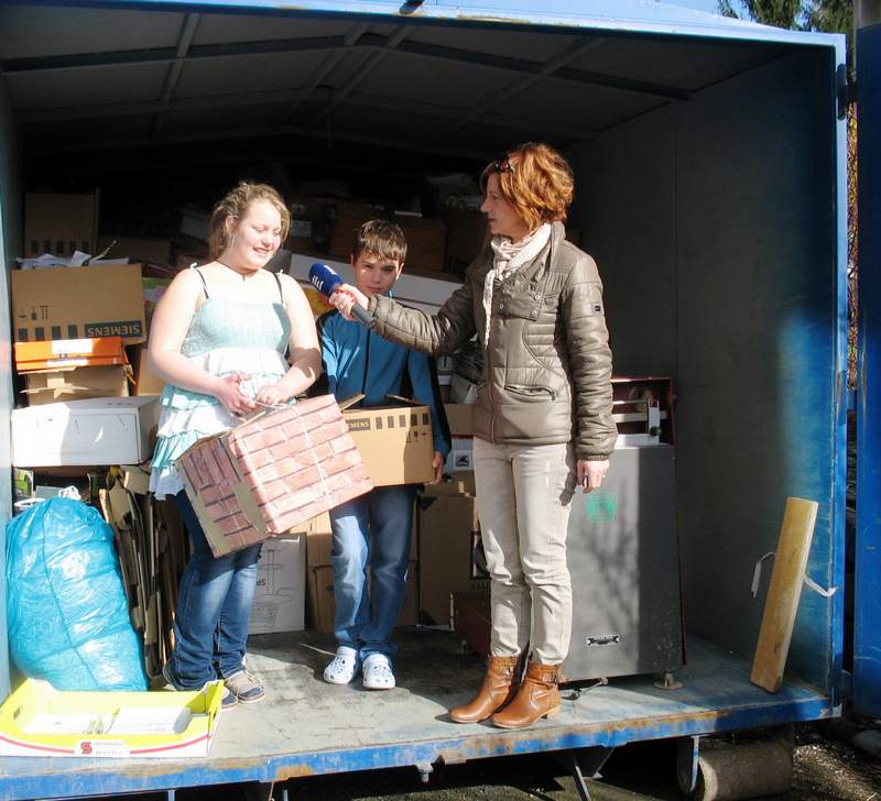 Třídíme odpadové suroviny a sbíráme starý papír a zájem o náš sběr projevily televize i rozhlas! Jak deváťáci pomáhají nakládat balíky papíru do přistaveného kontejneru, si přišla natočit paní redaktorka s kameramanem, a tak si kluci vyzkoušeli, co znamená být hercem. O pár dní později se pak krátký šot objevil v televizi, ale většina natočeného materiálu skončila ve střižně. Pro natáčení do rozhlasu jsme vybrali výřečné sběrače a díky mediální reklamě a pilným sběračům a jejich rodinám se podařilo až po střechu narvat tři kontejnery, a tak se třídy těší na pěkný výdělek. V hlavních rolích Fanda, Víťa, Vlasťa, Tom a Bára.