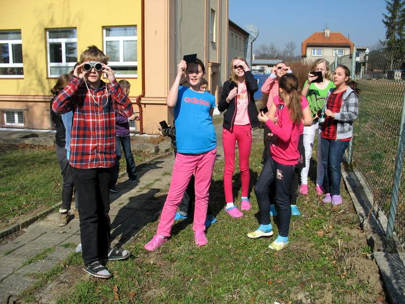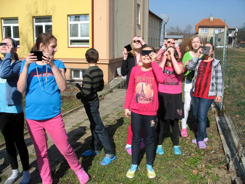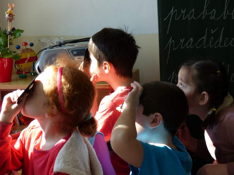 Málokdy vídaný solární úkaz představuje jednak přirozenou učební pomůcku, jednak jej může sledovat najednou velké množství dětí, neokouká se a je zadarmo. Zatmění je taky, ruku na srdce, mnohem přitažlivější program než třeba přísudek jmenný se sponou. A tak jsme koukali z oken, čučeli ze zahrady a dívali se z hřiště, jak Měsíc na své nebeské dráze dobíhá Slunce, zakrývá jeho kotouč, a když jej v poledne předběhl a opět propustil jeho paprsky přímo k Zemi, řekli jsme si všichni: „Hm, to je škoda.“ Další zatmění uvidíme až za osm let, ale toho si nejvíc užijí Eskymáci v Grónsku. U nás Měsíc ze slunečního kotouče „ukousne“ jenom 17 procent. Těšit se ovšem můžeme na 12. srpen 2026, kdy na západě republiky zakryje Měsíc 89 % slunečního kotouče a paní ředitelka už bude tři roky v důchodu. U nás na východě bude ovšem tou dobou Slunce již za obzorem, a tak se buď vydáme na západ, nebo zase nic!