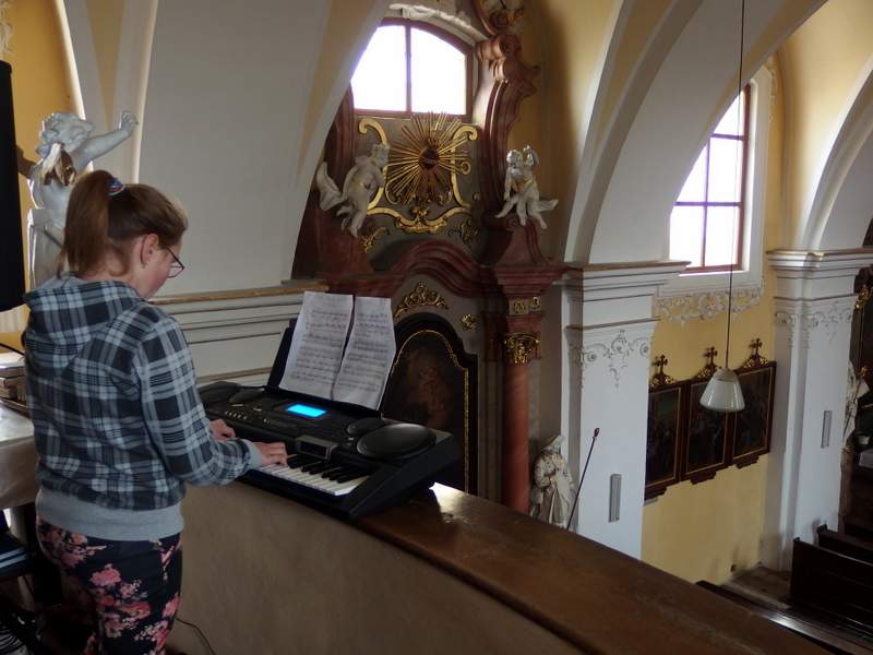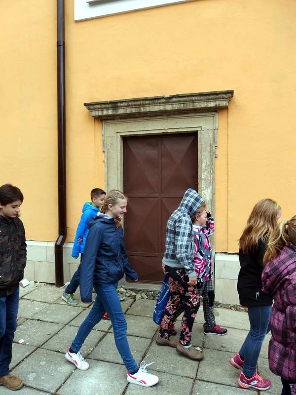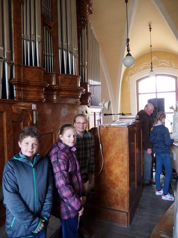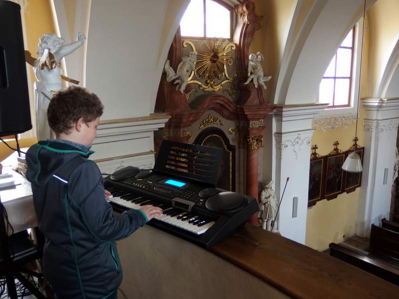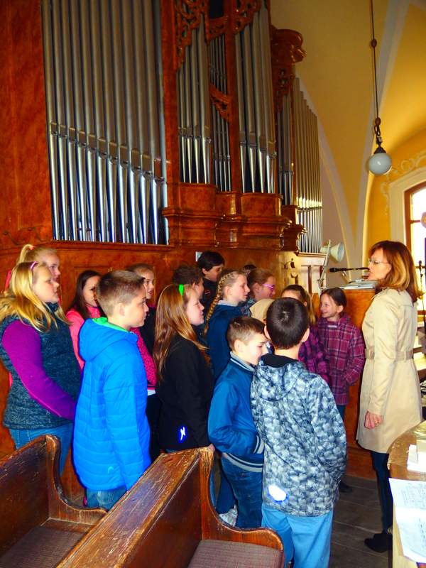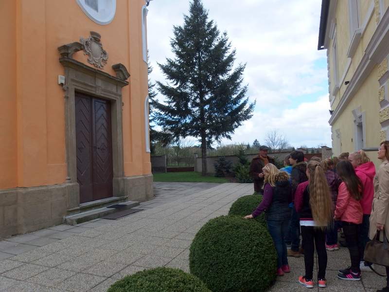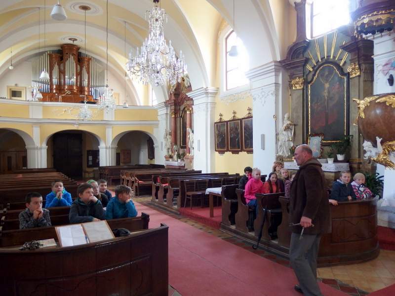Dřevohostickým barokem nás provedl pan kastelán. Jeho výklad děti doplnily hrou na klávesy a zpěvem, který se krásně nesl z kostelního kůru. Moc děkujeme za poučnou i zábavnou procházku uměleckými slohy i památkami našeho městečka. Páťáci