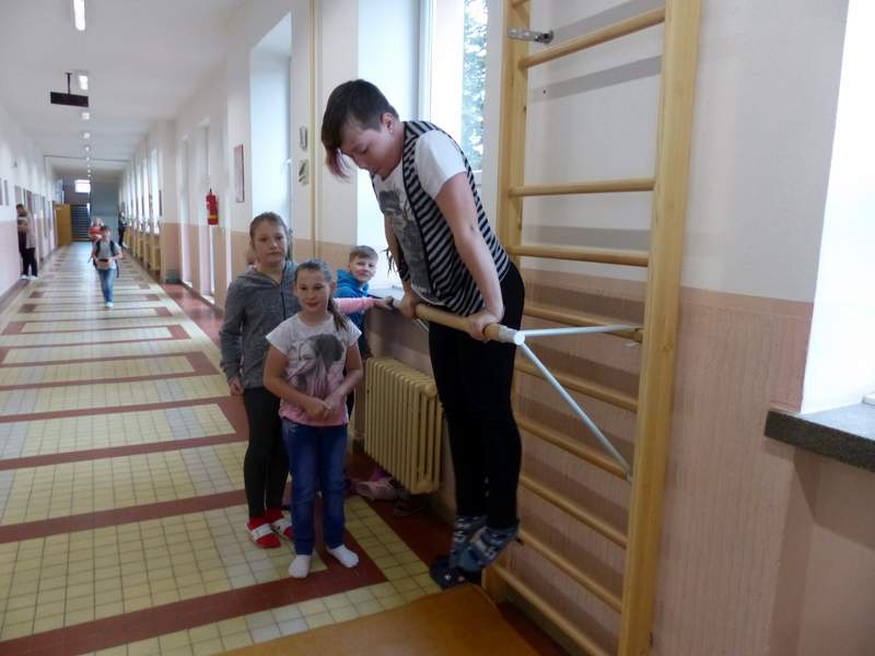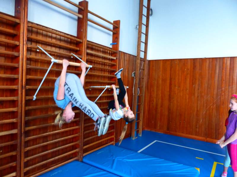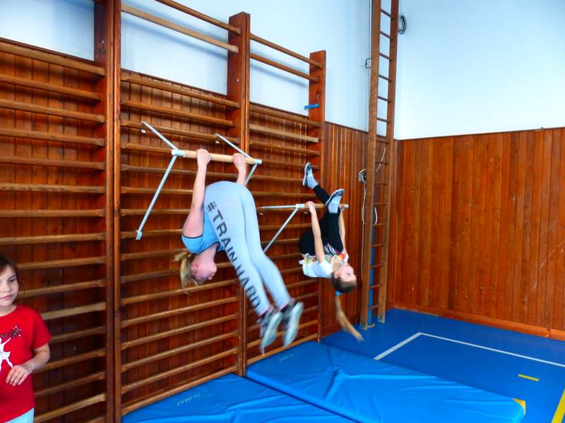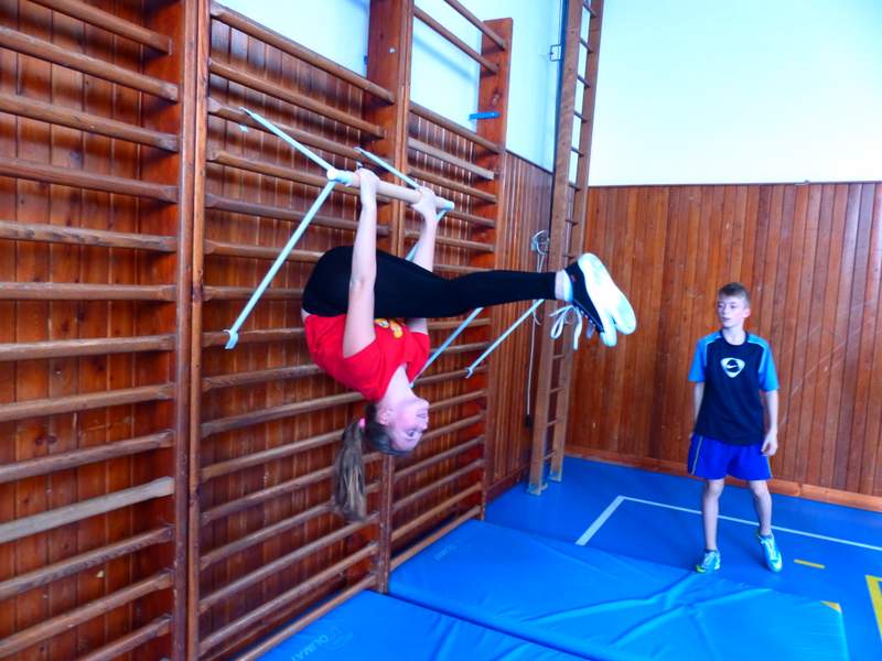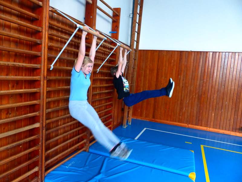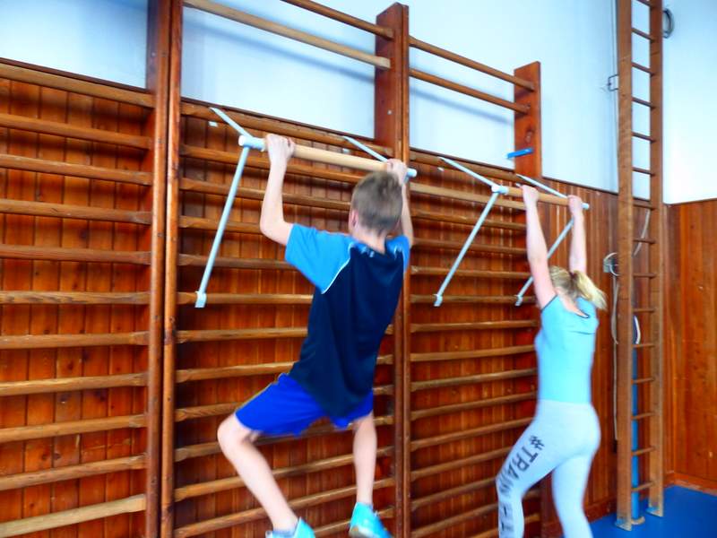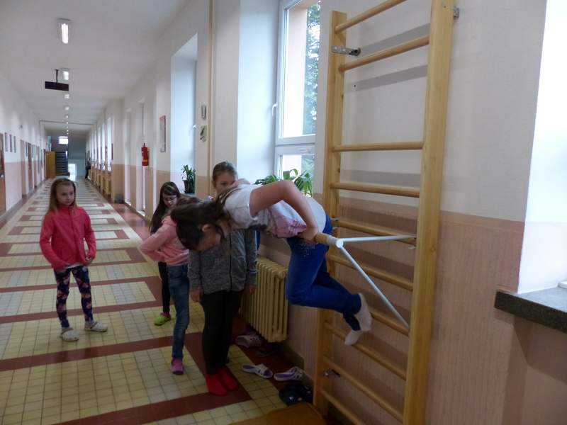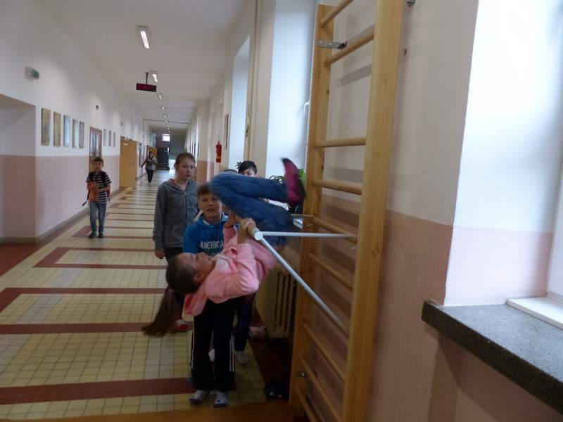 Přestávky s gymnastikou Díky panu Němečkovi ze Zlína, který věnoval naší škole 5000 Kč, jsme na školní chodby pořídili žebřiny s přídavnou hrazdou. Žáci mají o přestávkách možnost protáhnout svá těla a rozvíjet sílu a obratnost. A že cvičí. Stěžují si, že se jim na rukou loupe kůže. Udržují si tím své mozoly při cvičení shybů, svisů, vznesů a průvleků. Doufáme, že jim zájem vydrží a gymnastika už nebude pro mnohé strašákem. Zájmový kroužek Gymnastika