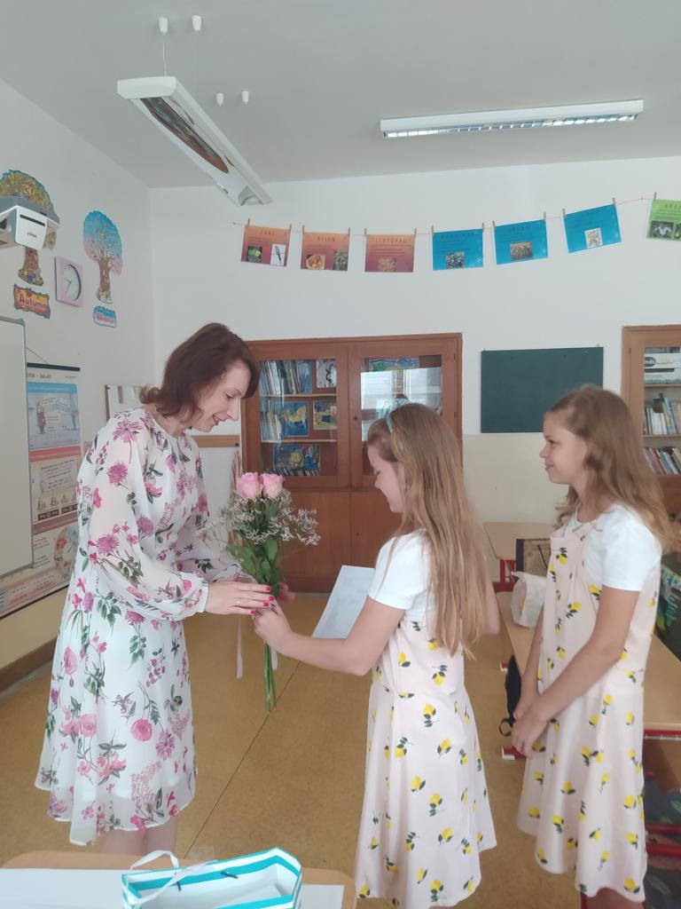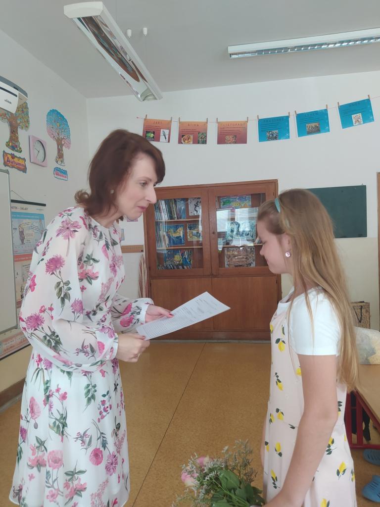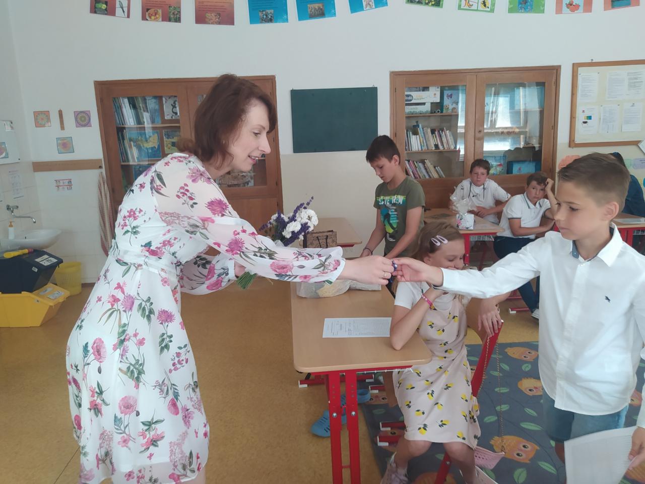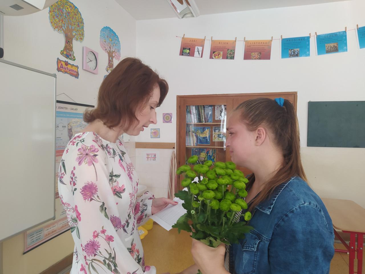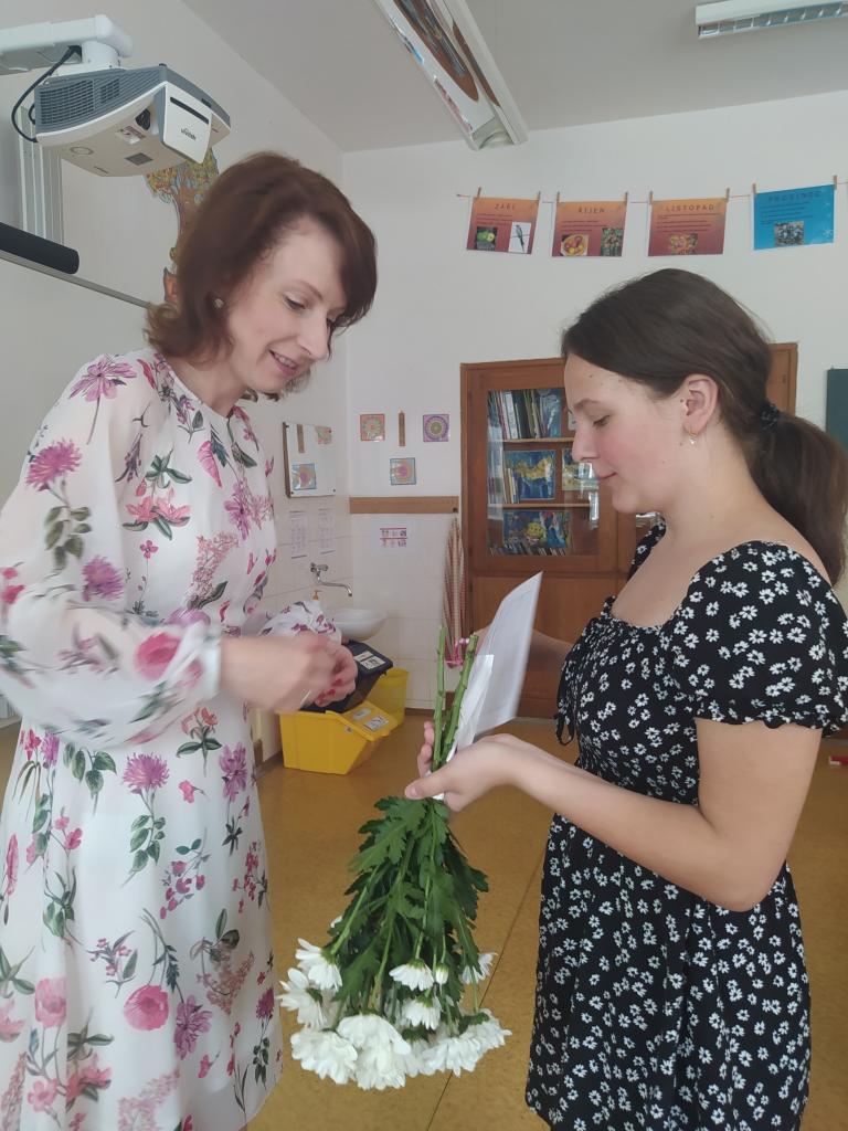 Rozdávání vysvědčení a poděkování paní učitelce