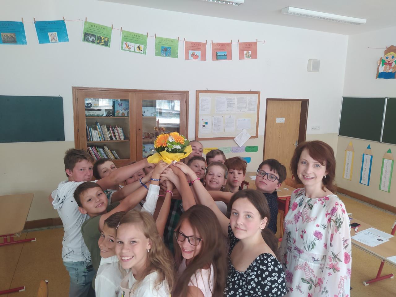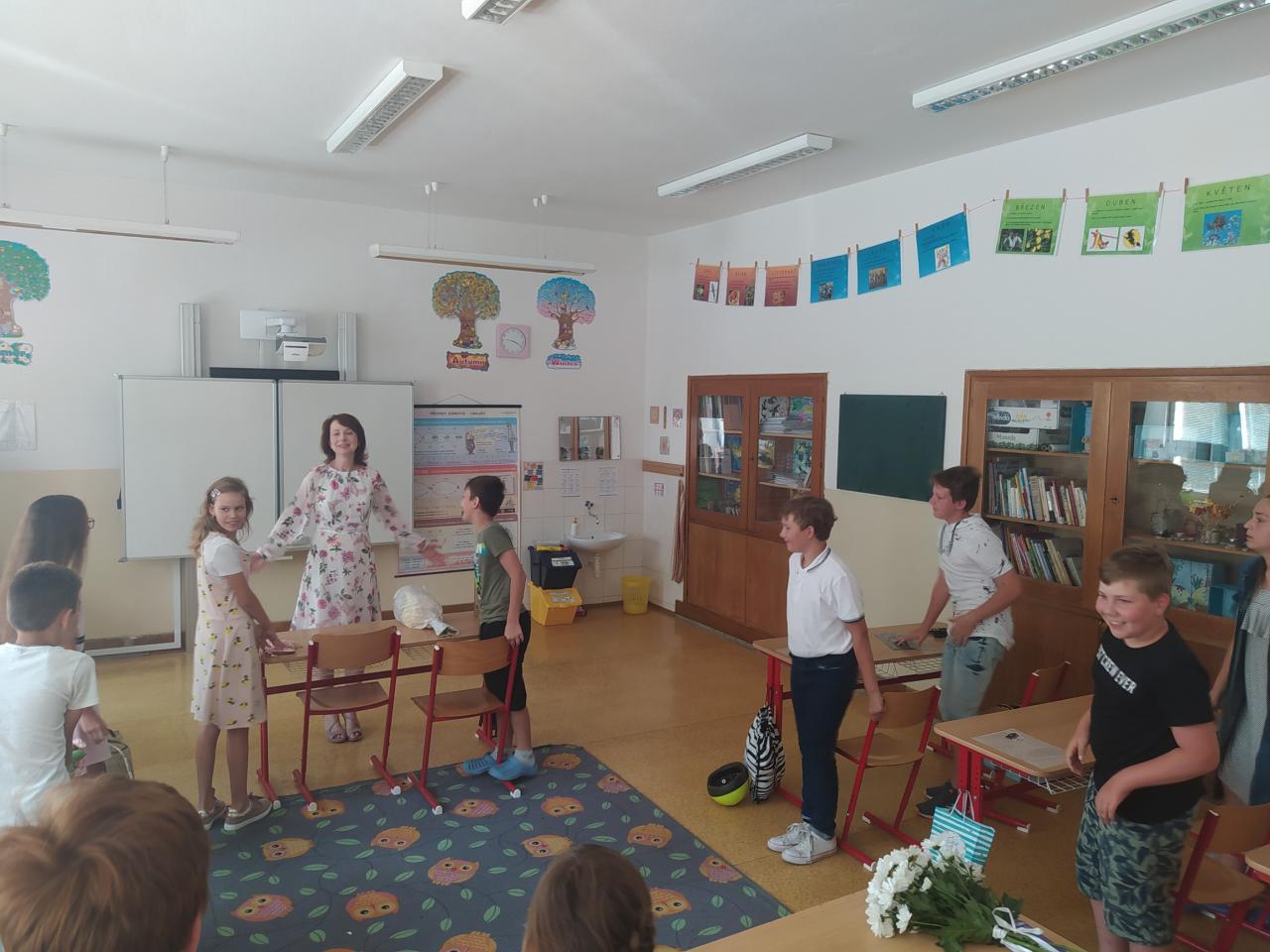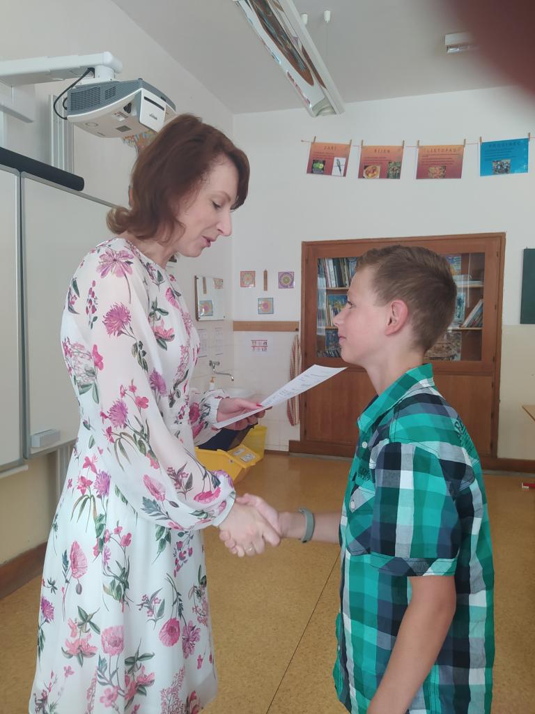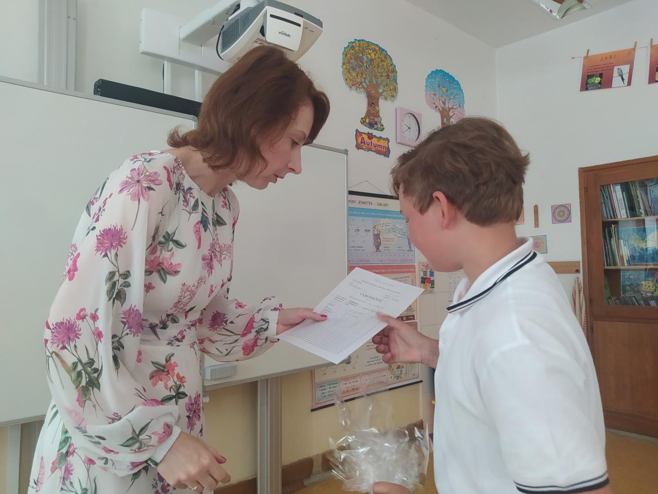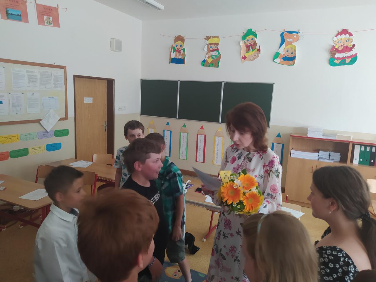 Rozdávání vysvědčení a poděkování paní učitelce