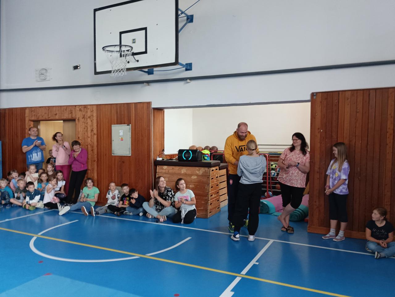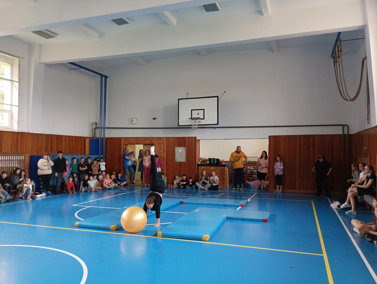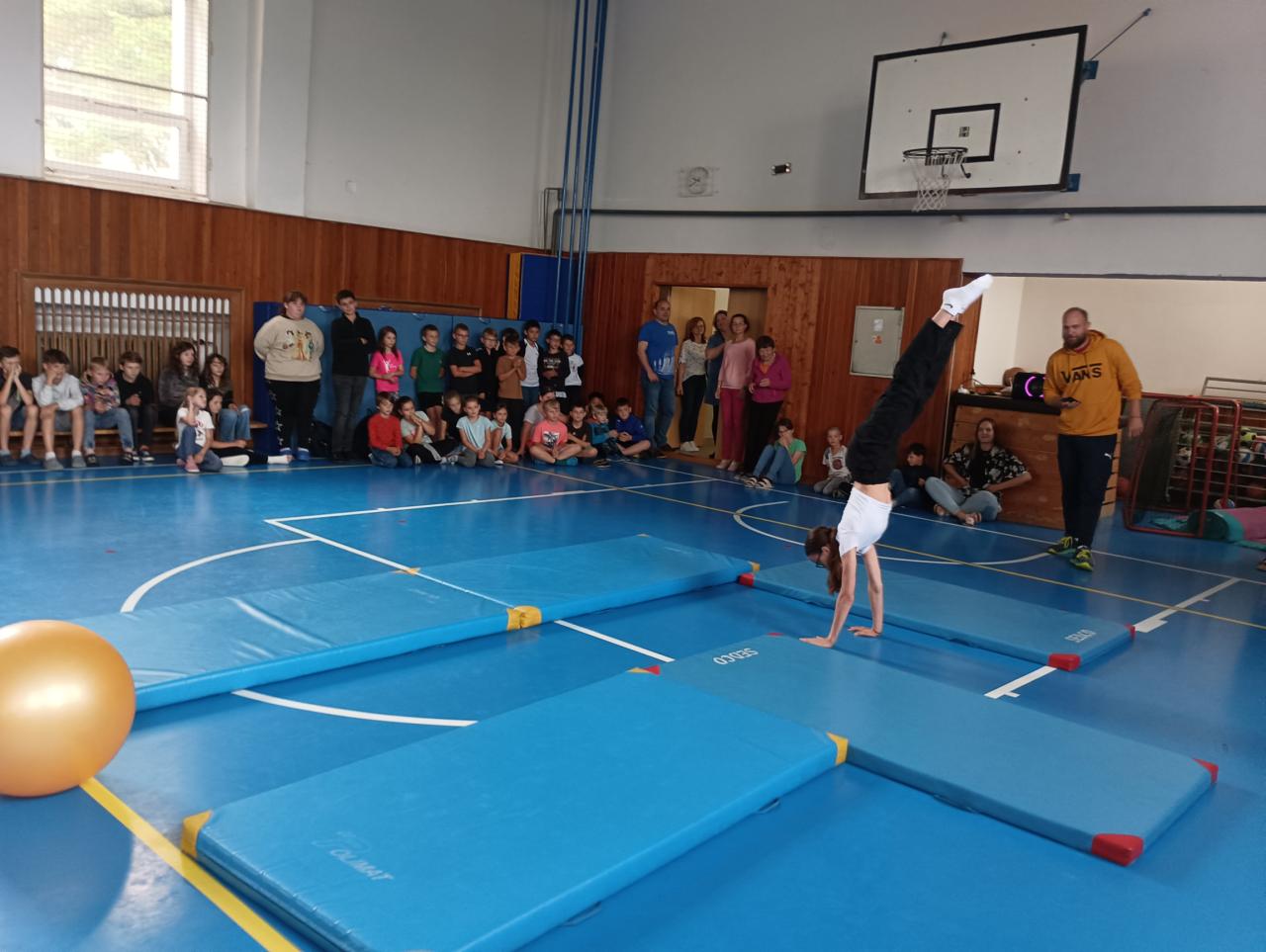 Projít po rukou vytyčenou trasu, na jejím konci posunout velký míč a to vše v co nejkratším čase. Do splnění této náročné disciplíny se odvážně pustilo pět děvčat a všechny si zaslouží náš obdiv! Opravdu bravurní výkon předvedla Kristýna Nováková, která prošla celou trasu na jeden zátah jakoby nic a nám všem spadla brada. Holkám nadšeně tleskala celá tělocvična.