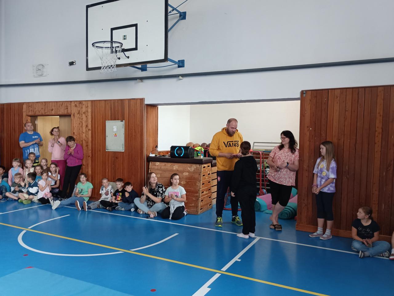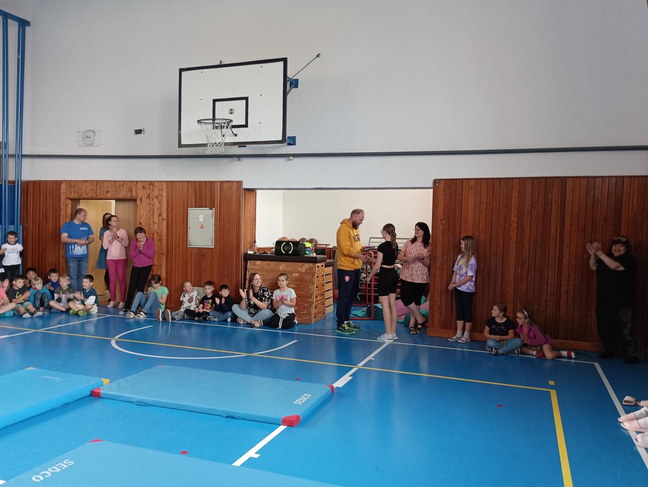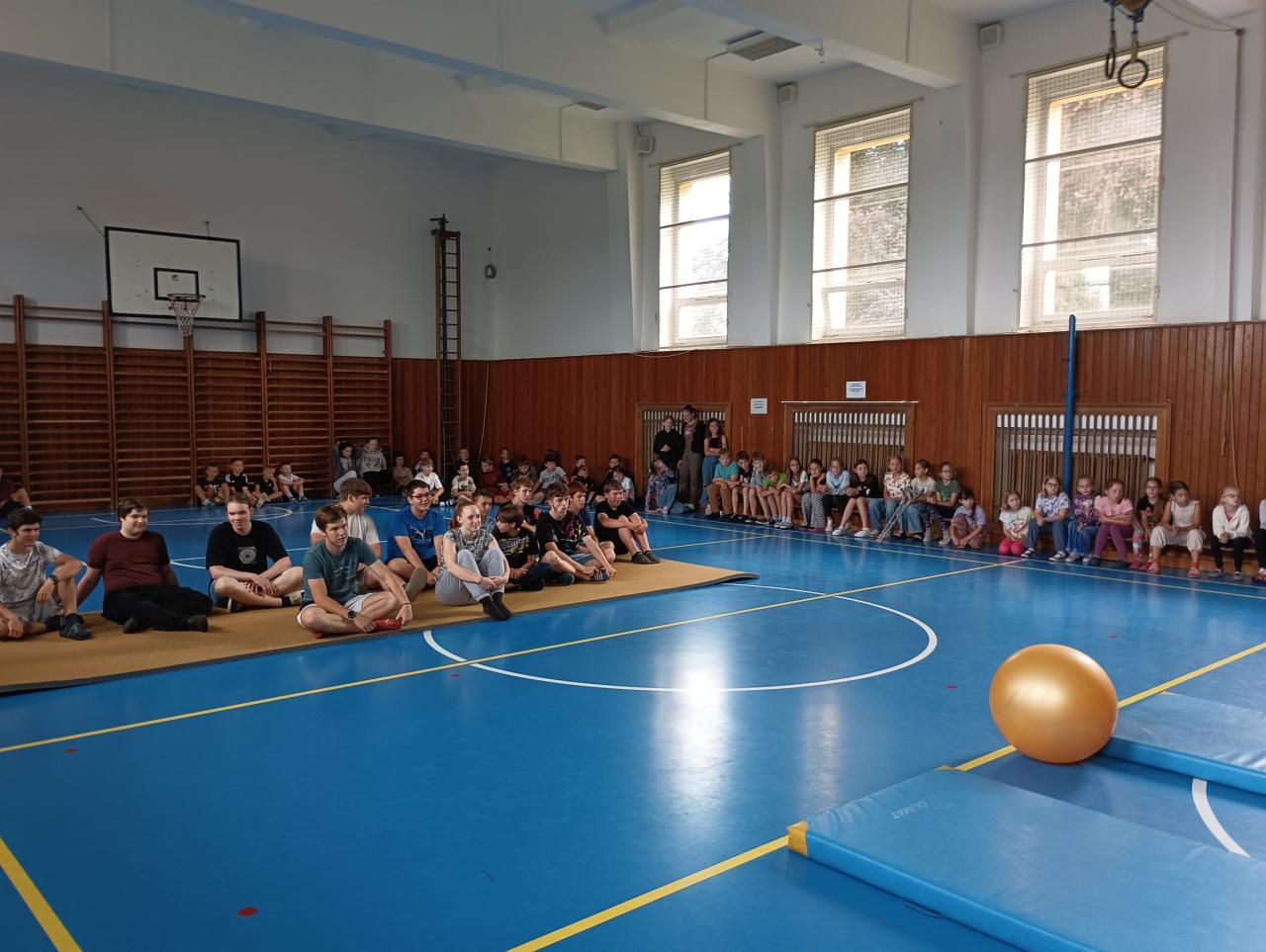 Projít po rukou vytyčenou trasu, na jejím konci posunout velký míč a to vše v co nejkratším čase. Do splnění této náročné disciplíny se odvážně pustilo pět děvčat a všechny si zaslouží náš obdiv! Opravdu bravurní výkon předvedla Kristýna Nováková, která prošla celou trasu na jeden zátah jakoby nic a nám všem spadla brada. Holkám nadšeně tleskala celá tělocvična.