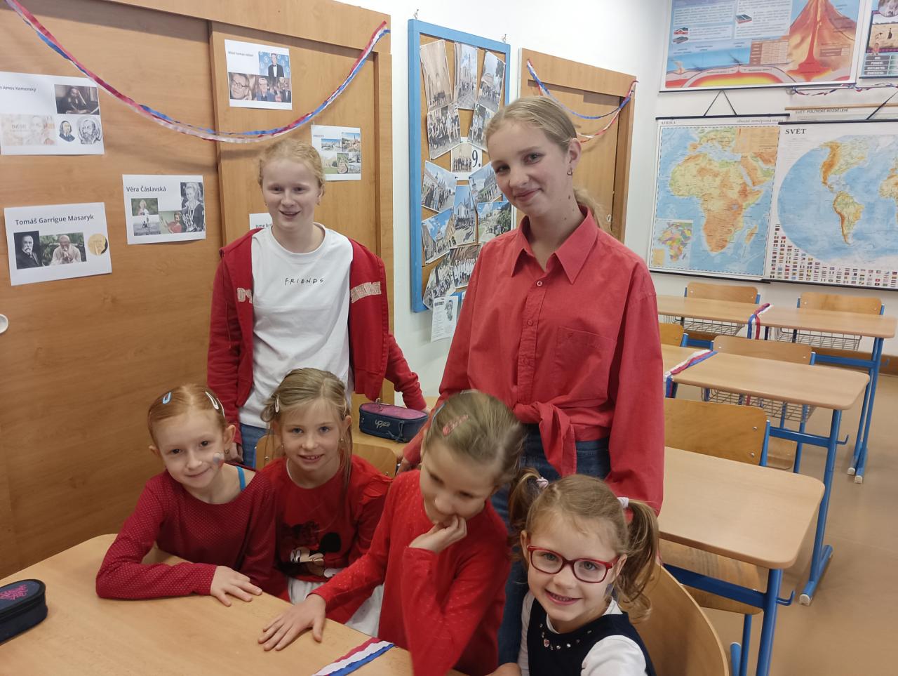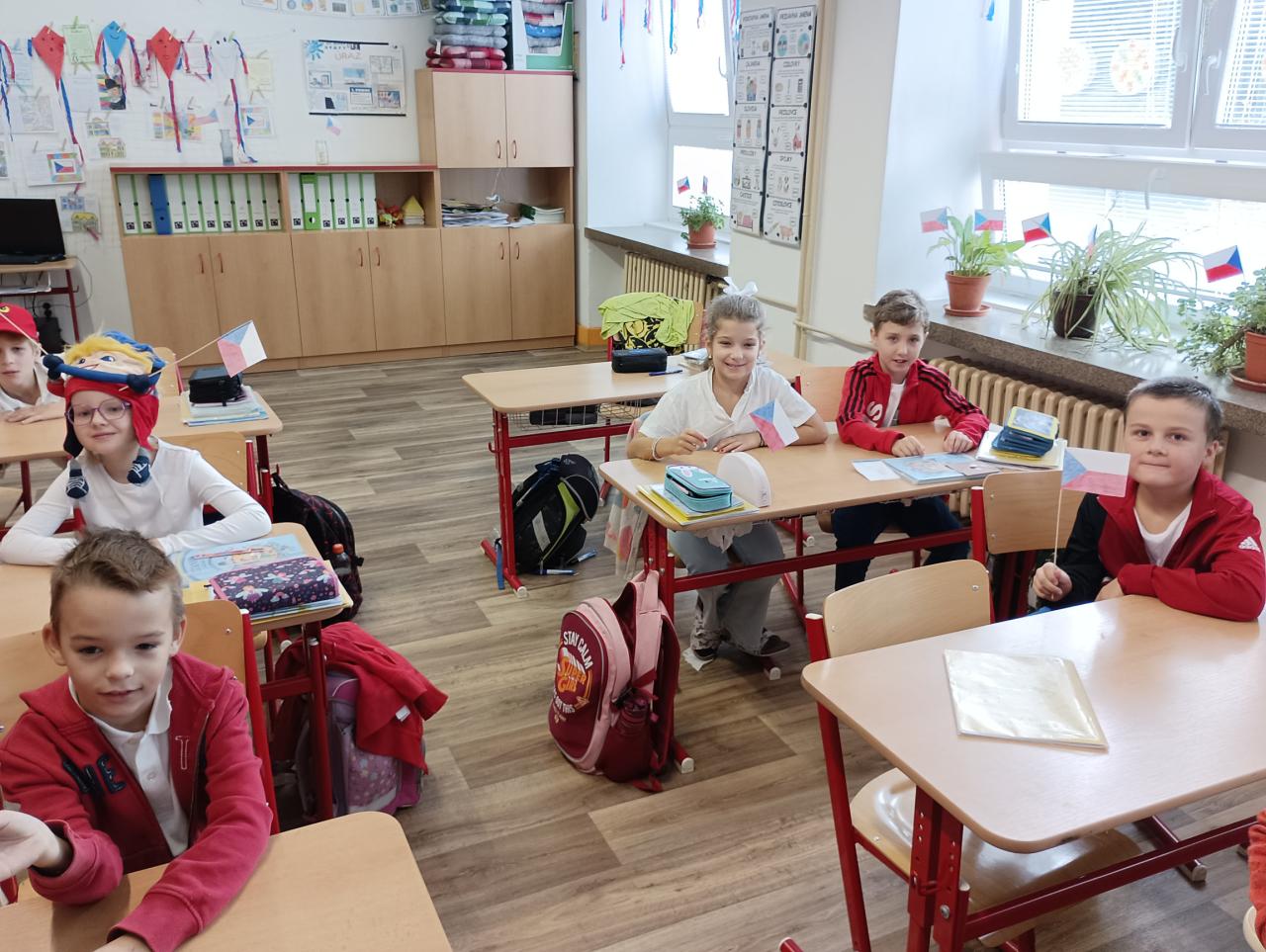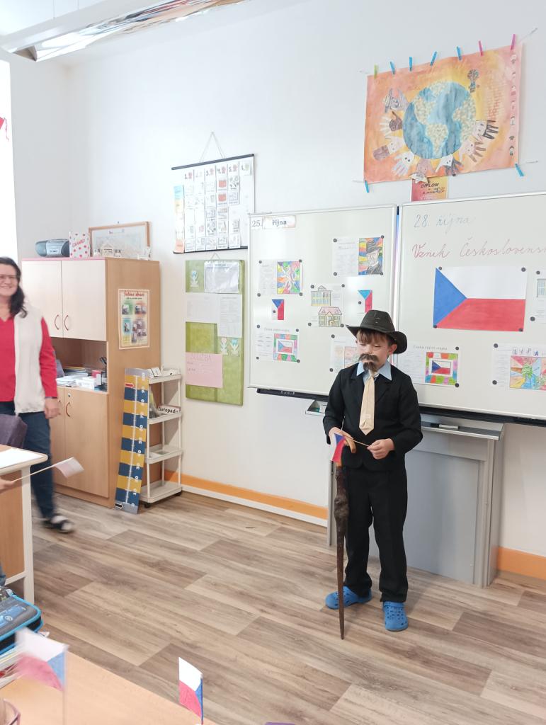 Žáci, učitelé i asistenti pedagogů se oblékli do barev trikolory a někteří k tomu přistoupili opravdu velmi kreativně. Na fotkách tak můžete obdivovat obarvené vlasy, vlajky na tvářích, trojbarevné mašle, ale také ponožky a všelijaké kloboučky. Vyzdobené byly nejen třídy, ale i jejich vstupní dveře. Ve 3. třídě nás dokonce přivítal samotný T. G. Masaryk. Každá třída přistoupila k výzdobě trochu jiným způsobem, ale většina z nich věnovala přípravě dnešního dne hodně úsilí. Kromě pocitu sounáležitosti a hrdosti na naši vlast si z dnešního dne odnášíme také mnoho zajímavostí o vzniku samostané československé republiky.