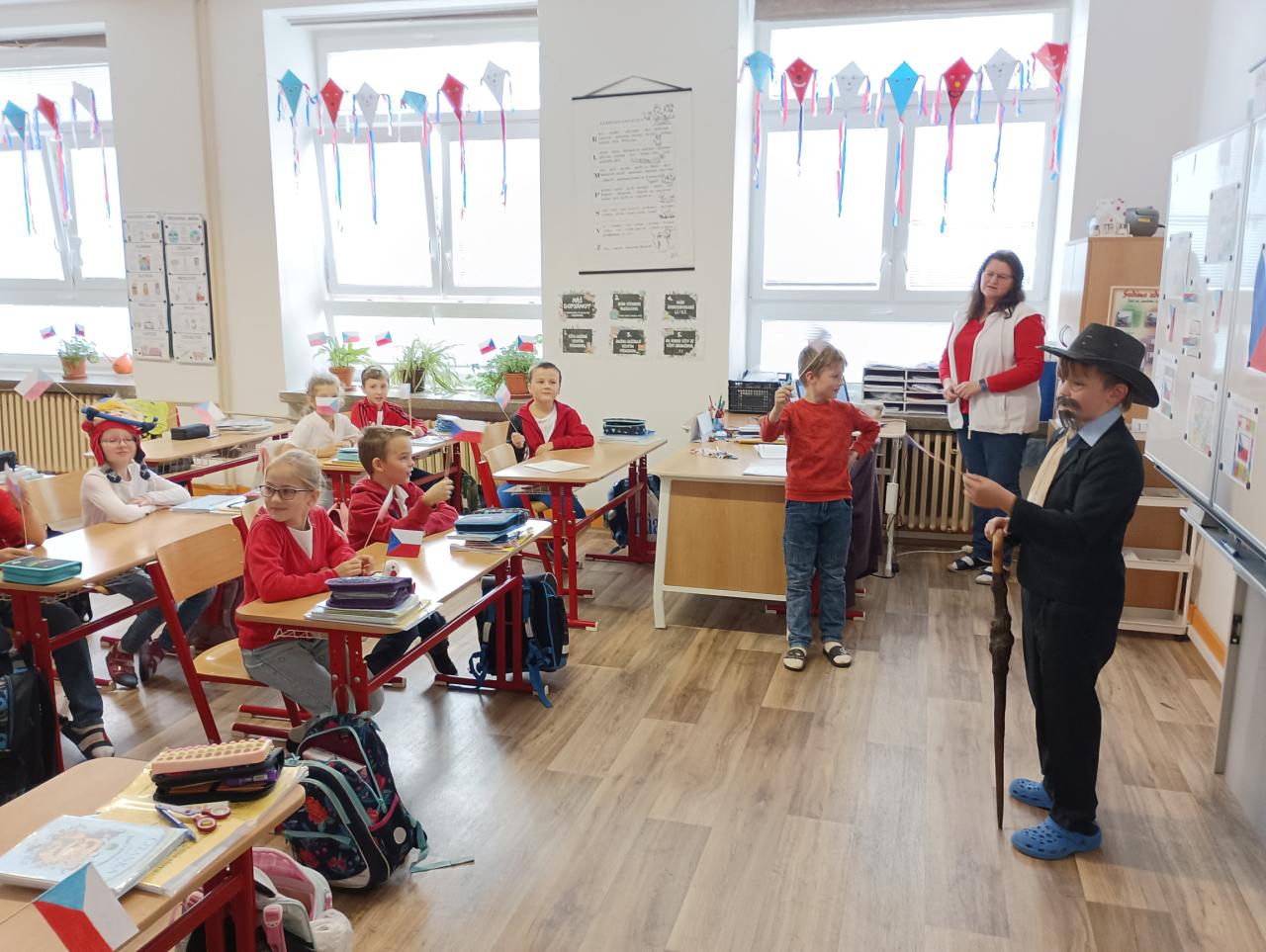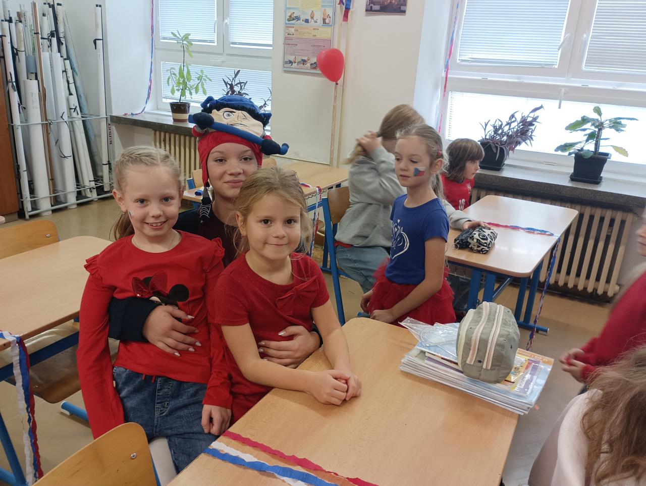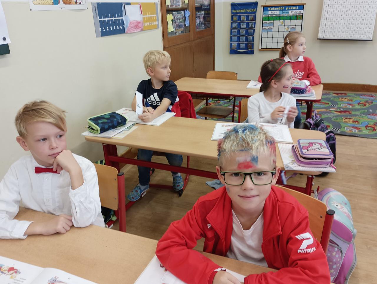 Žáci, učitelé i asistenti pedagogů se oblékli do barev trikolory a někteří k tomu přistoupili opravdu velmi kreativně. Na fotkách tak můžete obdivovat obarvené vlasy, vlajky na tvářích, trojbarevné mašle, ale také ponožky a všelijaké kloboučky. Vyzdobené byly nejen třídy, ale i jejich vstupní dveře. Ve 3. třídě nás dokonce přivítal samotný T. G. Masaryk. Každá třída přistoupila k výzdobě trochu jiným způsobem, ale většina z nich věnovala přípravě dnešního dne hodně úsilí. Kromě pocitu sounáležitosti a hrdosti na naši vlast si z dnešního dne odnášíme také mnoho zajímavostí o vzniku samostané československé republiky.