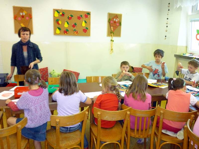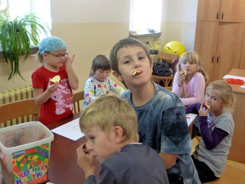 V úterý 25. září 2012 jsme ve školní družině uspořádali výstavu jablíček s názvem "Přichází čas jablíčkových vůní". Děti si přinesly jablíčka, ze kterých jsme udělali malou výstavku. Společně jsme pozorovali jejich barvy a tvary, pověděli jsme si o sadě, sklizni, uskladnění jablíček a výrobě moštů. Vysvětlili jsme si přísloví "Jablko nepadá daleko od stromu". Zazpívali jsme si písničku "Měla babka čtyři jabka" a naučili jsme se k ní tancovat mazurku. Každé dítě si mohlo vybrat libovolnou výtvarnou techniku a namalovat si nebo vyrobit jablíčko. Po skončení výstavky jsme jablíčka nakrájeli a ochutnali a společně jsme určovali název druhu jablíček.