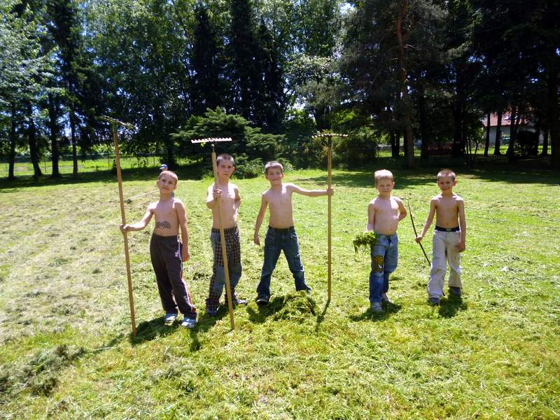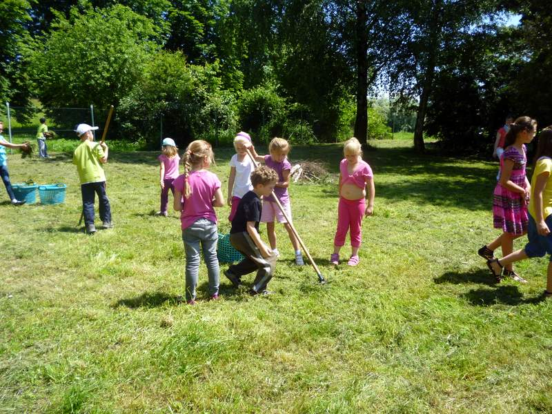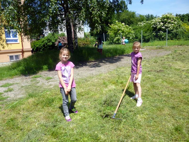 Po celý rok navštěvovaly děti z družiny školní zahradu a hrály zde nejrůznější hry. Ale protože "bez práce nejsou koláče" a zahrada byla plná posekané trávy, přiložily i děti ruce k dílu a pomohly trávu ze zahrady uklidit. Sluníčko pěkně svítilo a děti se do práce pustily s velkou vervou, takže za chvíli jsme měli hotovo a děti si mohly na zahradě zase s radostí hrát. Za jejich pěknou práci je paní vychovatelky odmění vycházkou na zmrzlinu.